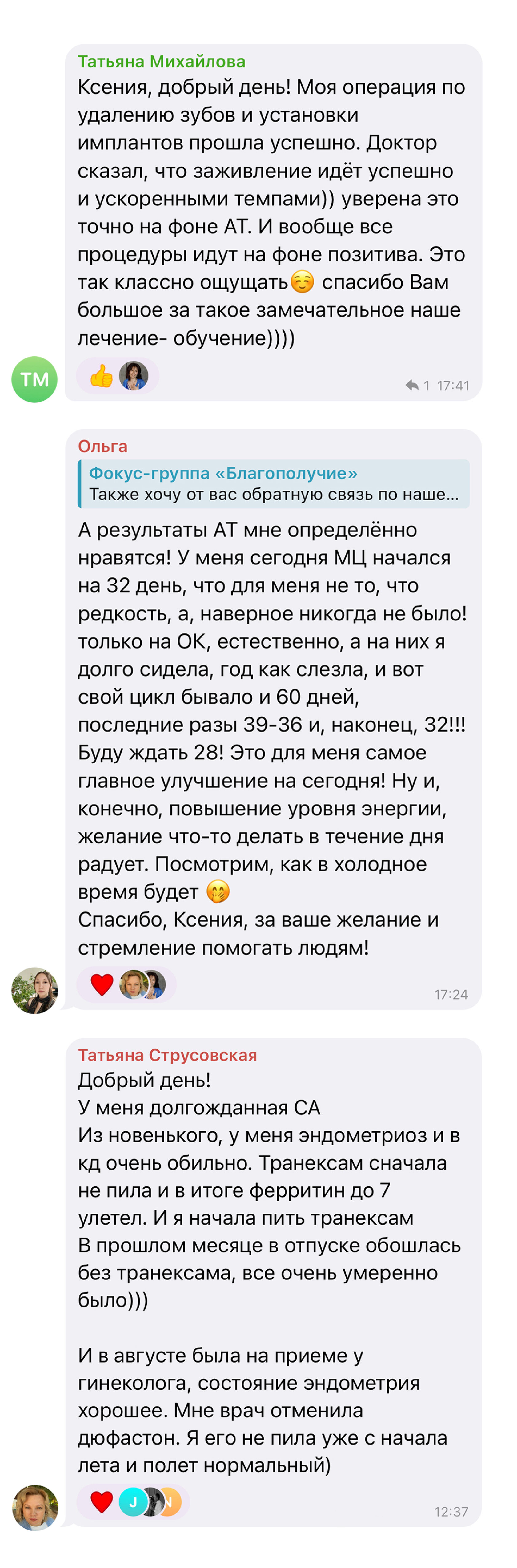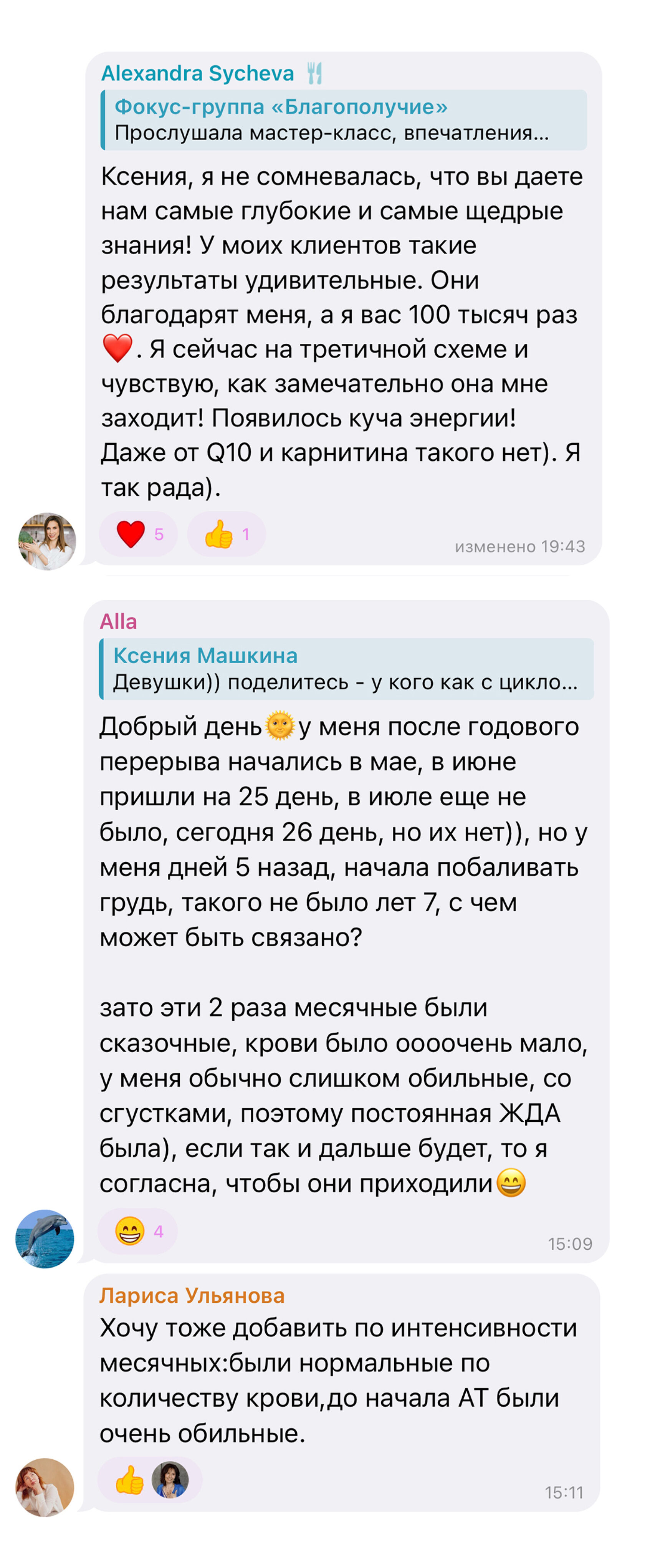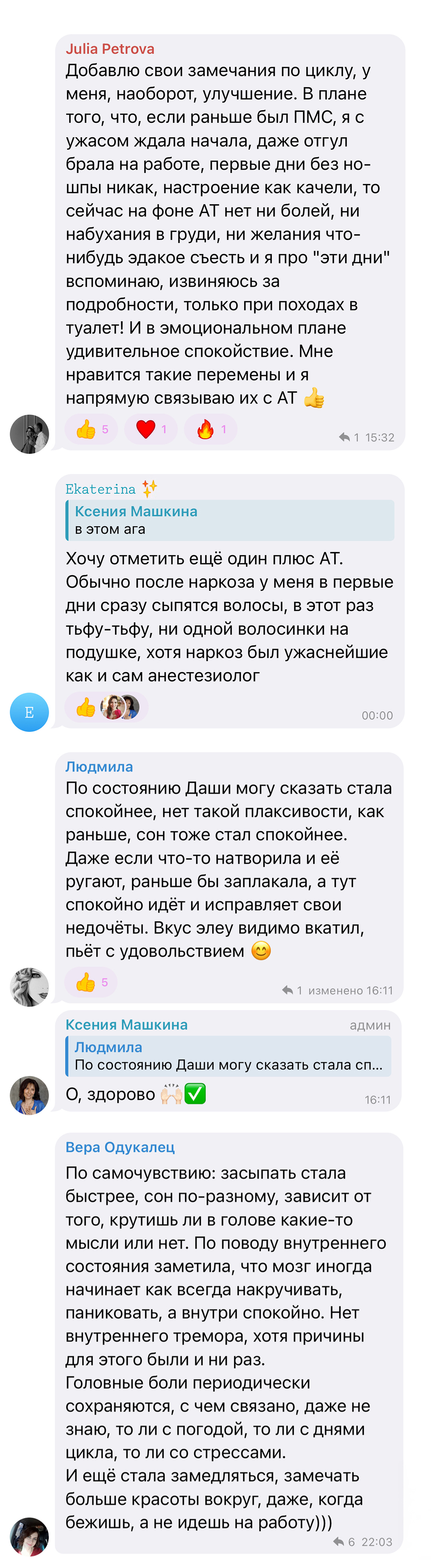 «Улучшился сон, быстрее решаются задачи, повысилась работоспособность, научилась отдыхать, улучшились отношения в семье, перестала замечать цикл»
