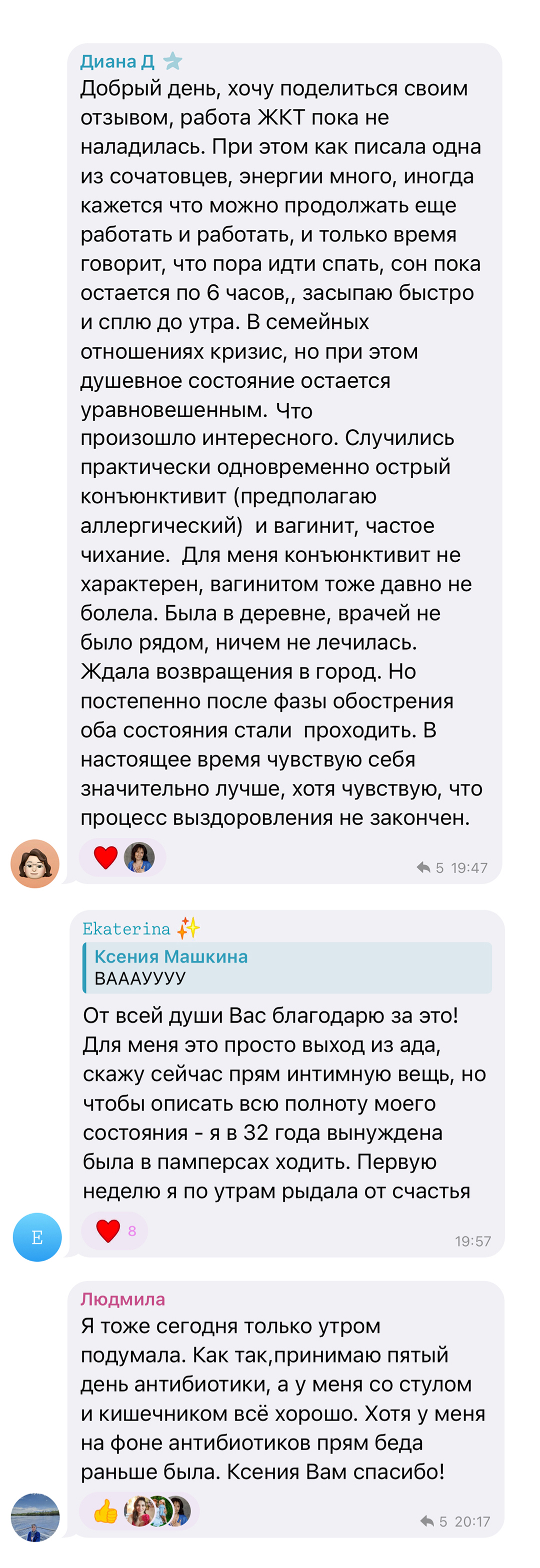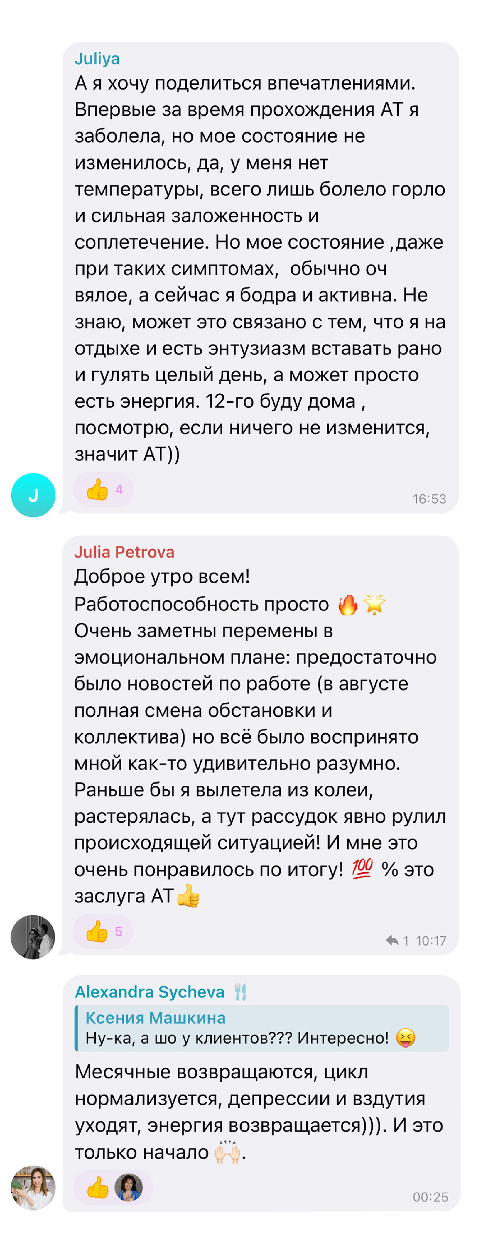 «Стала спокойнее, рассудительнее. Герпес не возвращается, ушли симптомы ПМС, наладился цикл. Стала жить здесь и сейчас, воспринимаю красочно каждый день»