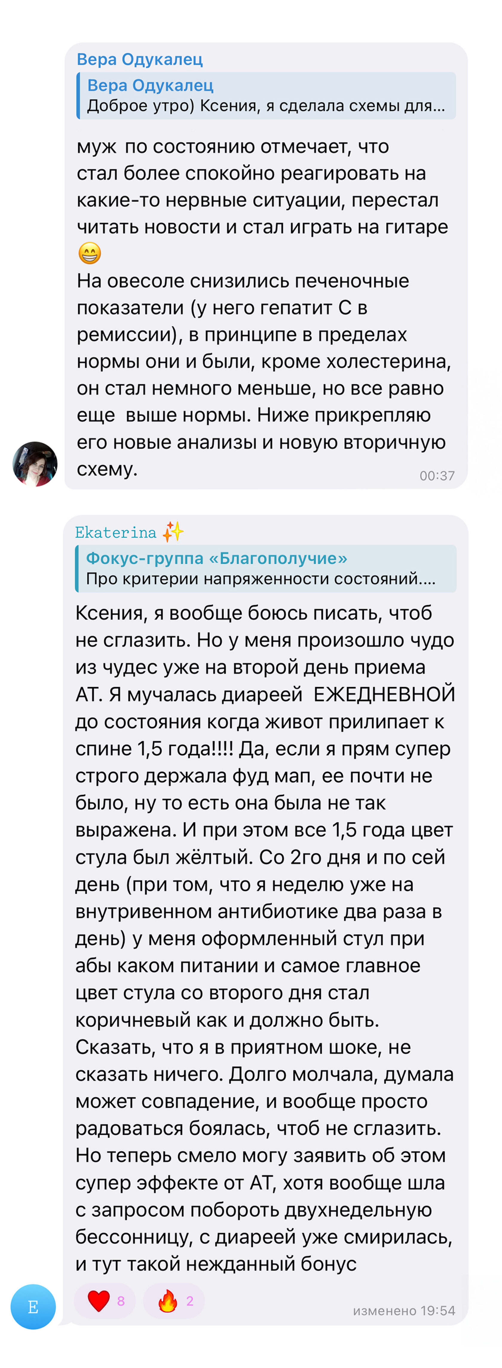 «Нормализовались печеночные показатели, стала спокойнее относиться ко многим вещам, у мужа проходят высыпания на ноге, на локте»